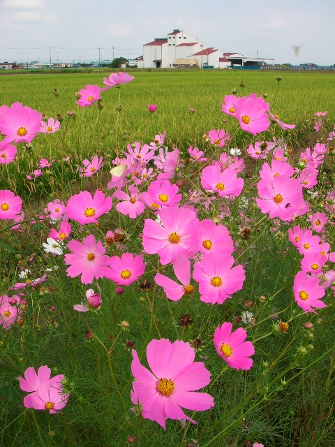 今日、日曜日(10月4日)。菜園への行き帰り、ところどころにコスモスが植えられていて、目を楽しませてくれます(写真 3 )。妻沼周辺の田んぼも黄金色に色付き始め、早いところでは稲刈りが始まっていました。